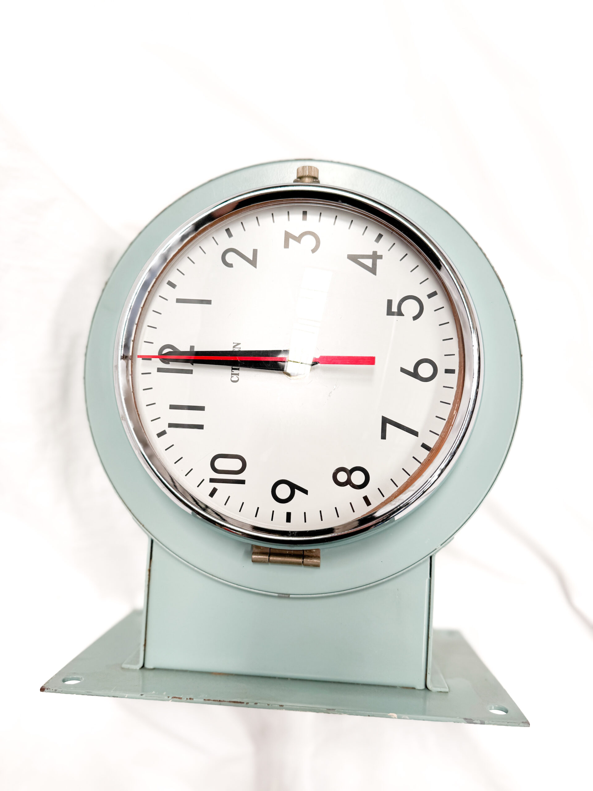 ตัวเรือนโลหะสีเขียวโทน marine green ให้กลิ่นอายวินเทจแบบอุปกรณ์อุตสาหกรรม ขอบกระจกหนาพร้อมบานพับสำหรับการดูแลรักษา หน้าปัดสีขาวตัดกับตัวเลขสีดำขนาดใหญ่ อ่านง่ายตามแบบฉบับนาฬิกา Citizen ที่เน้นความชัดเจนและความเที่ยงตรง